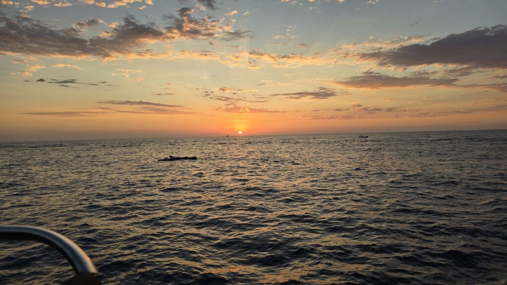 At sunrise, we cast free and motored to Bird Rock to meet Kim. For a moment, everything felt normal. The first golden light spread across the ocean, the island at our backs, Kim’s paddleboard cutting clean lines across the swell. We were the first support boat to link with our paddler, handing her fresh water and fuel for the miles ahead.