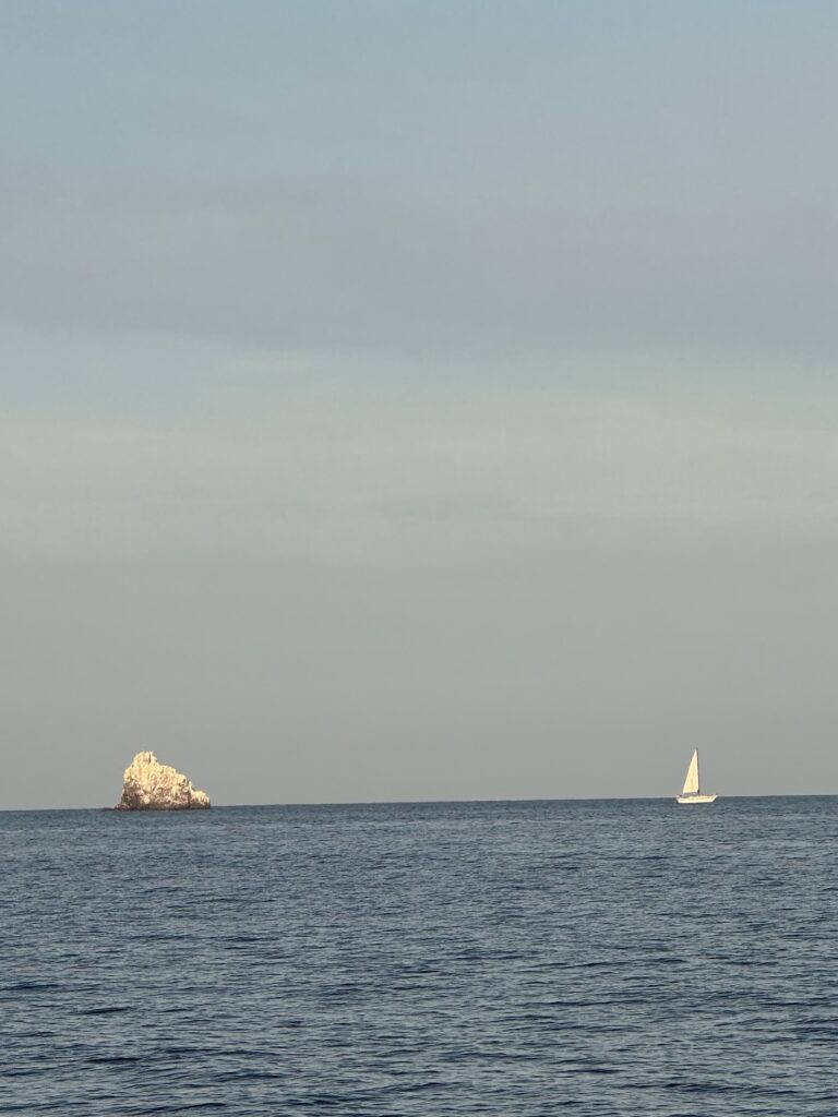We limped under sail, inching toward Bird Rock. But then the wind shadow swallowed us. Air gone. Sails limp. The boat began sliding backward, out to sea.
