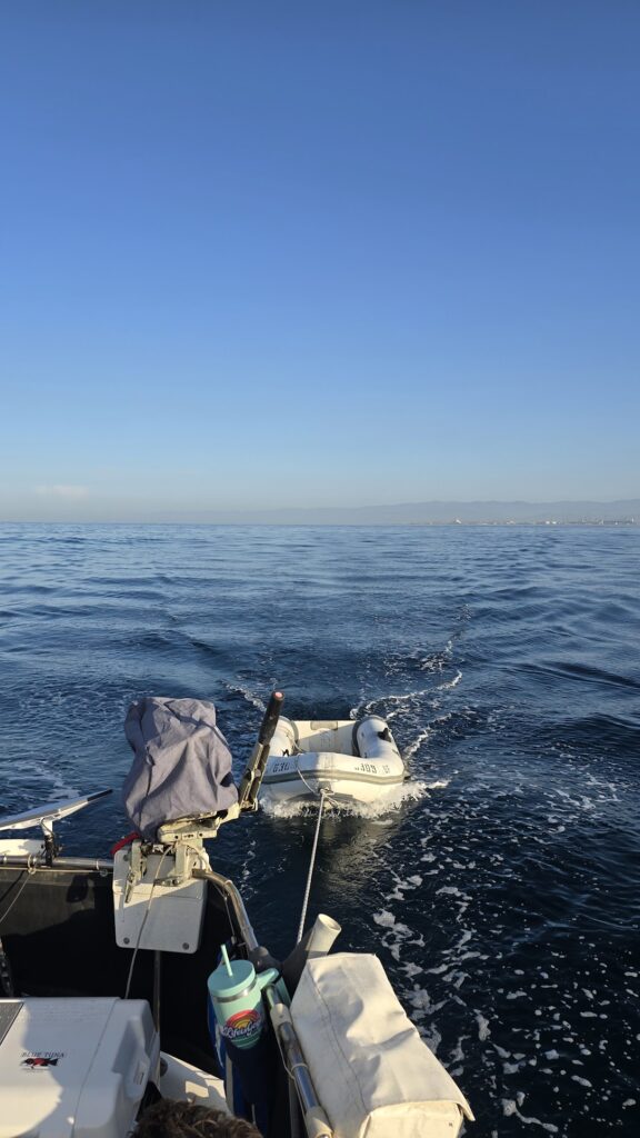 A red hull cut across the horizon—Bay Watch. They knew Kim’s boyfriend. After a sharp scolding for not sailing well while sick, they tossed us a line. For free.